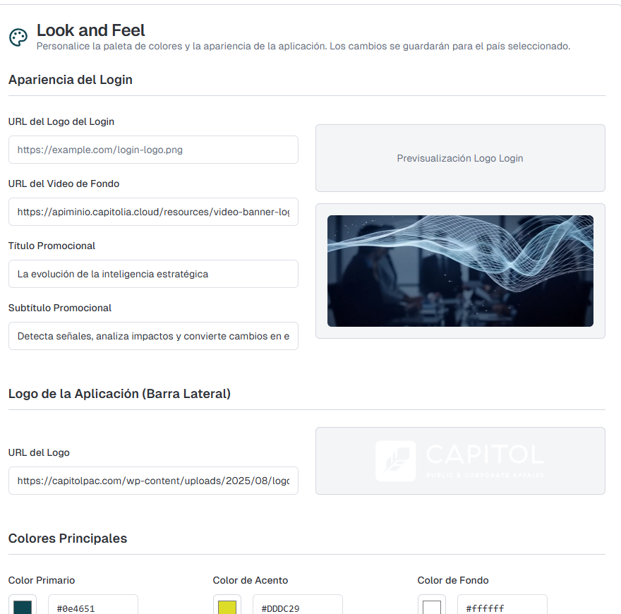 Apariencia del Login: Puede cambiar el logo, el video de fondo, y los textos promocionales que se muestran en la pantalla de inicio de sesión.