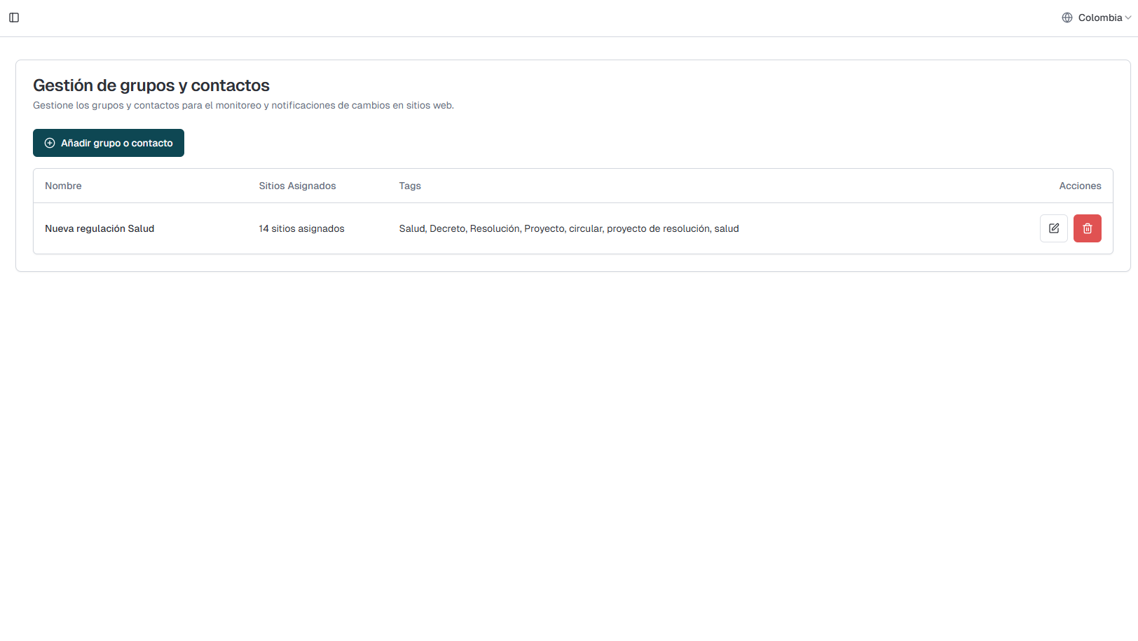 Esta sección permite gestionar los grupos y contactos para el monitoreo y notificaciones de cambios en sitios web.