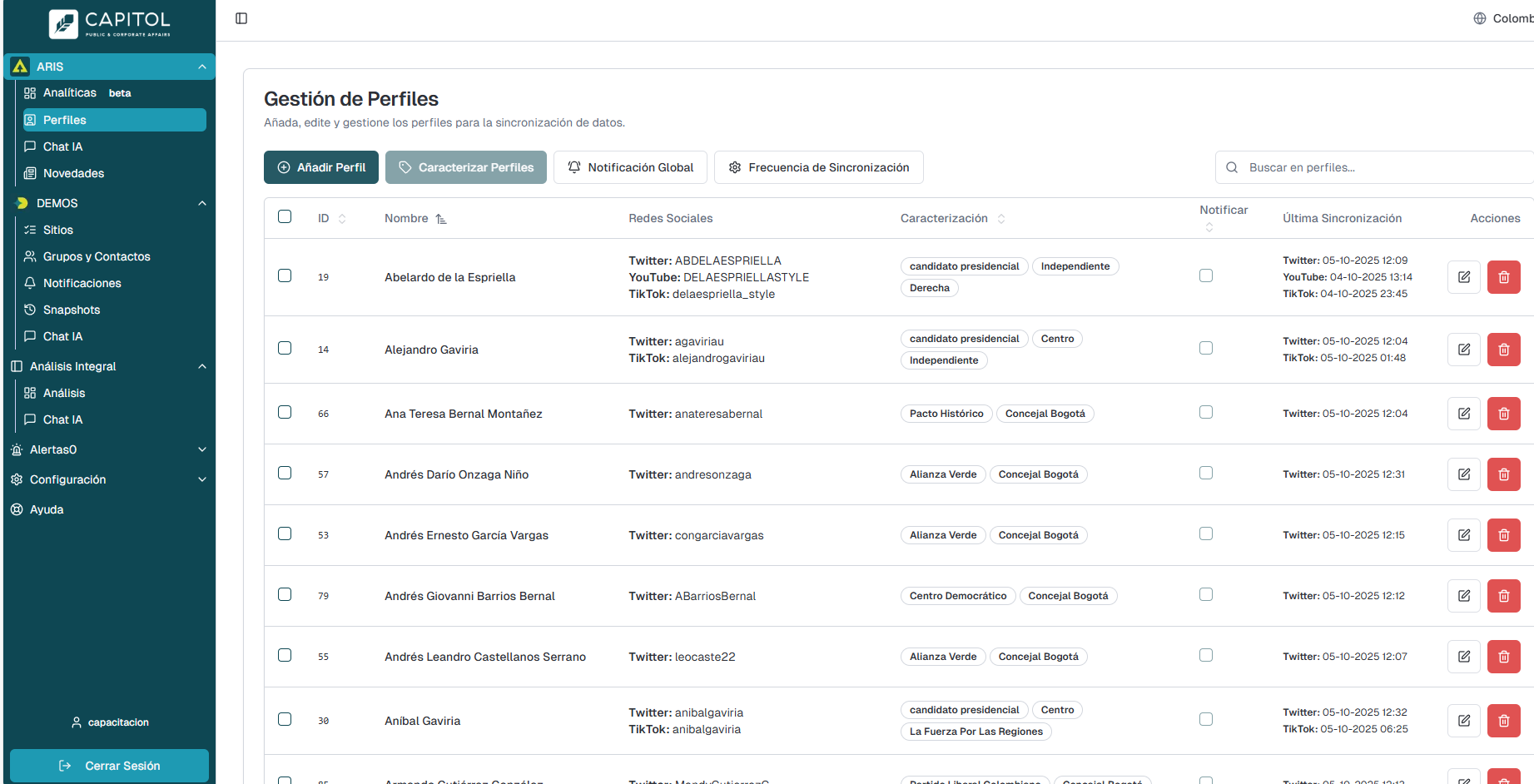 Gestión de los perfiles (individuos, organizaciones, etc.) que se monitorean en la plataforma. Puede añadir nuevos perfiles, editar los existentes o eliminarlos.