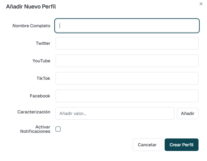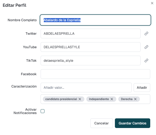- Caracterización: Permite la caracterización y clasificación de los usuarios. Los valores no son predeterminados, el usuario puede crear la cantidad de valores que el usuario requiera. Añada etiquetas o categorías para clasificar el perfil (ej: "Político", "Medio de Comunicación", "Oposición"). Esto ayuda a filtrar y agrupar perfiles en futuros análisis