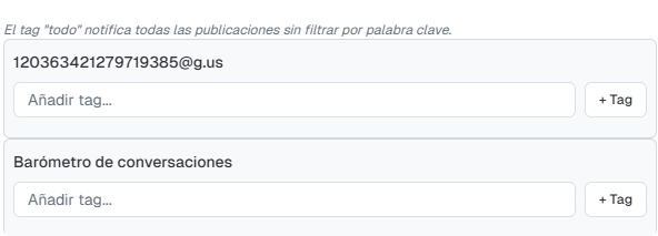 Esta sección permite configurar las notificaciones de la monitorización de los perfiles. Para esto se asociará con el número de WhatsApp asignado en la sección de “Integraciones” los grupos a los cuales se quiere notificar.