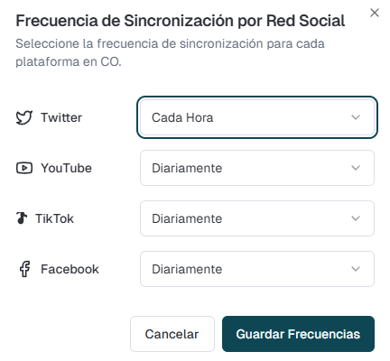 Esta sección permite configurar frecuencia en que se quiere realizar la sincronización de cada una de las plataformas para el monitoreo de redes sociales.