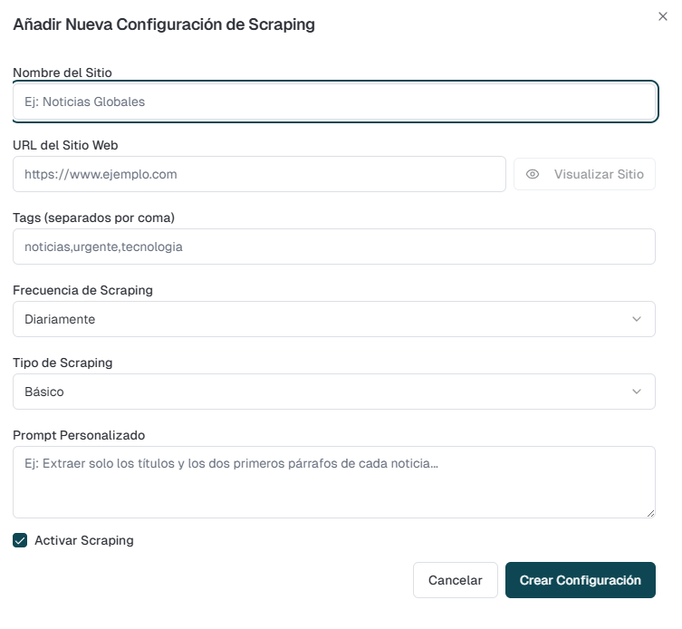 Pantalla de añadir nueva configuración Configuración de Sitios de scraping.